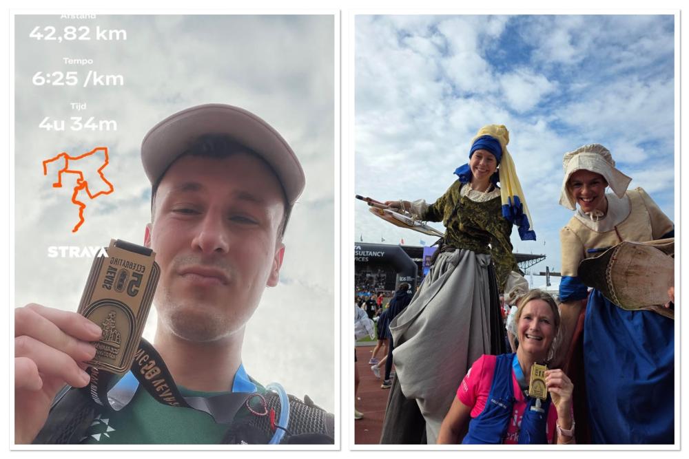 Op de hele marathon ging Gina van start, waar Peter vd Z. ook ineens opdook in de gemaakte filmpjes. Ook Peter had verrassend de stoute hardloopschoenen aan gedaan voor deze afstand! Hij had dan ook goed naar het schema van Marc gekeken. Bijna gezamenlijk gestart en gezamenlijk over de finishlijn, een mooie prestatie, in niet de makkelijkste, wel een hele mooie marathon.